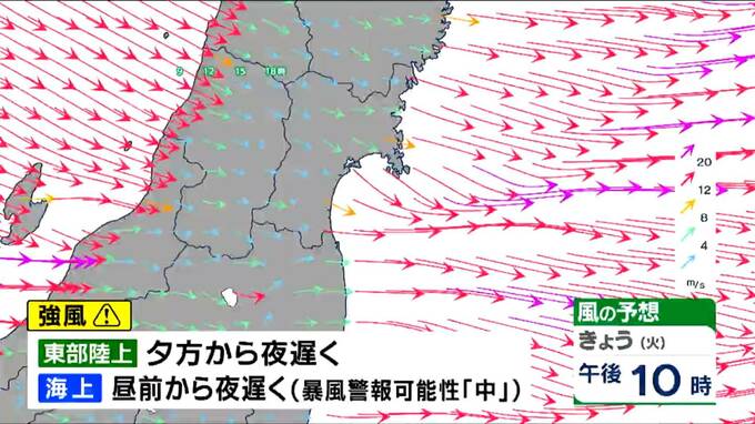 日中は気温上昇で仙台・最高気温11℃ 夕方からは天気下り坂…西部を中心に雨や雪 海上では強風にも注意 tbc気象台 東北放送 2026年1月13日(火) 11:30 国内 天気 西寄りの風強まる ピークは夜あたりか 13日は風も強まります。西寄りの風が強まり、ピークは夜あたりとなりそうです。東部の陸上では夕方から夜遅くにかけて、海上では昼前から夜遅くにかけて注意が必要です。海上では暴風警報が出されるおそれもあります。