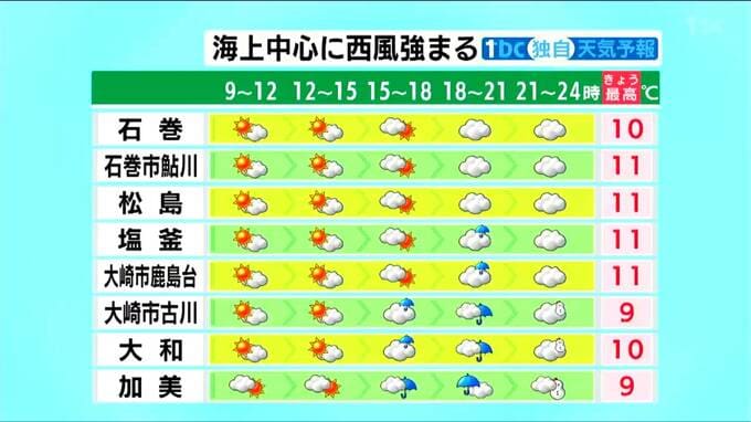 ■石巻:最高気温10℃ ■石巻市鮎川:最高気温11℃