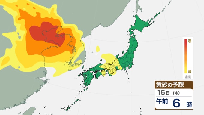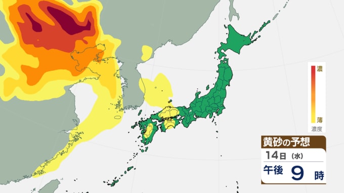 【黄砂情報】16日(金)は「濃い黄砂」に注意 14日(水)夜から飛来スタート 黄砂シミュレーション 長崎放送 2026年1月13日(火) 12:00 国内 黄砂の飛来予測(1月14日~16日) ◆黄砂シミュレーション ▶1月14日(水) 夜: 九州北部や山陰地方から飛来が始まる見込みです。 ◆黄砂シミュレーション(15日~) ▶1月15日(木): 影響範囲が東へ拡大し、中国・四国、近畿、東海、北陸にかけて広く到達する見込みです。