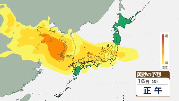 ▶1月16日(金): 今回の飛来のピークとなる見通しです。 西日本から東日本、さらに北日本の広い地域で濃度が一段と濃くなる(オレンジ色の予測エリア)時間帯があり、空が黄色くかすんだり、車が汚れやすくなったりする恐れがあります。