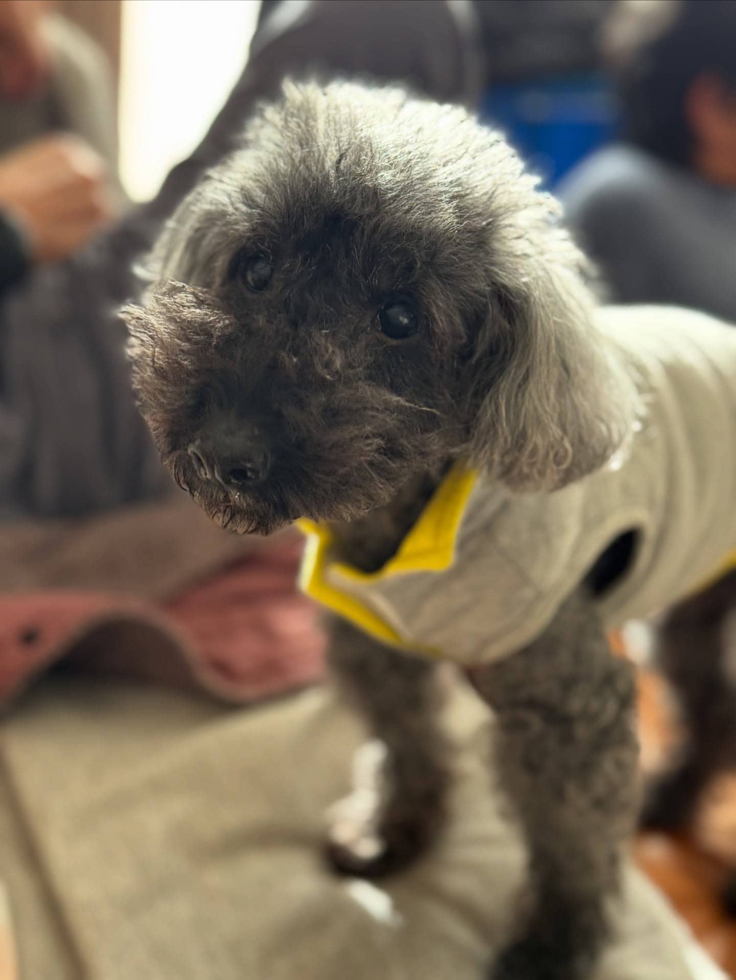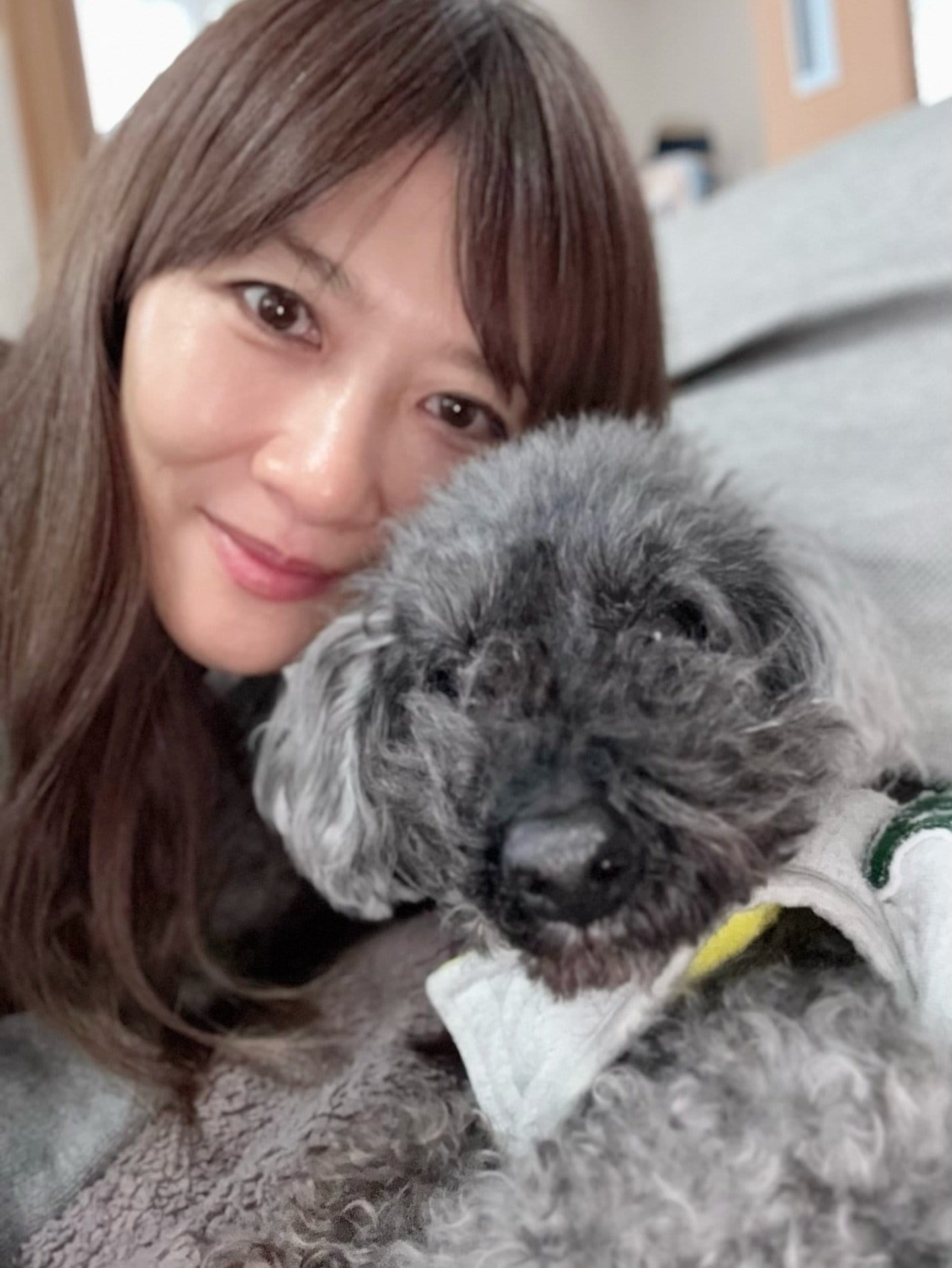 愛犬ハルくんについて、「歳は取っていたけど、食欲もあるし元気そうだったからまだまだ長生きしてほしい」と、藤崎さんの愛情が伝わるコメントをし、黄色い襟がついた灰色の洋服を着たかわいらしいハルくんの姿も公開。