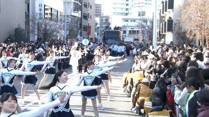 今年の箱根駅伝で10時間37分34秒の大会新記録で3年連続9度目の総合優勝を果たした青山学院大学が25日、優勝報告会と地元での優勝パレ―ドを行った。
