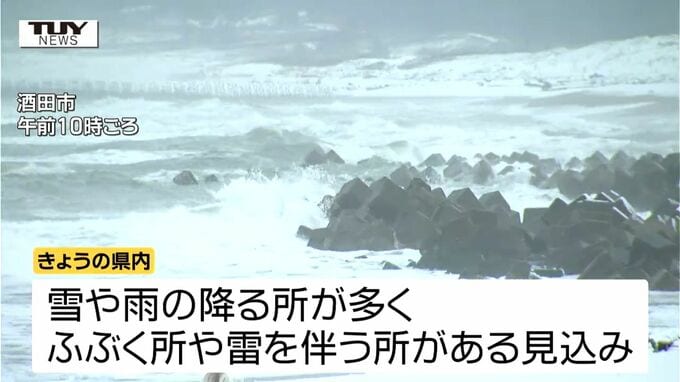山形地方気象台によりますときょうの県内は低気圧や前線の影響により、雪や雨の降る所が多く、ふぶく所や雷を伴う所がある見込みです。