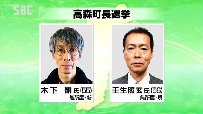 高森町長選挙に立候補したのは届け出順に、いずれも無所属で、新人で農業の木下剛(きのした・つよし)さん55歳、現職で3期目を目指す壬生照玄(みぶ・しょうげん)さん56歳の2人です。