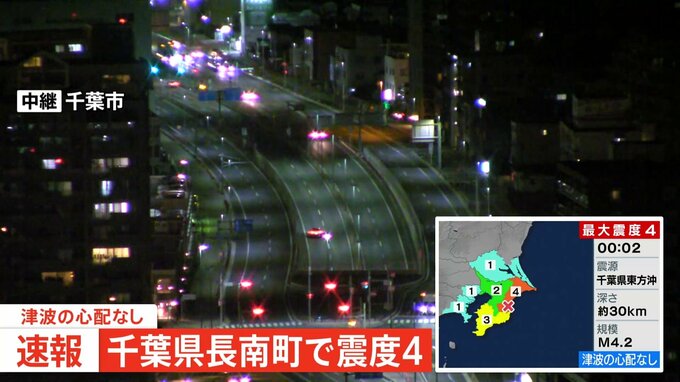 気象庁の観測によりますと、午前0時2分ごろ、千葉県北東部で震度4を観測するやや強い地震がありました。最大震度4を千葉県の長南町で観測したほか、震度3を茂原市、大網白里町などで観測しています。震源は千葉県…