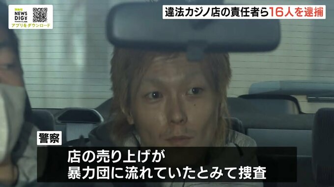 違法カジノ店3店舗を摘発…責任者ら16人逮捕 「十三駅東口に賭博店がある」情報をもとに系列店を特定 売り上げは暴力団に流れていたか 毎日放送 2026年1月13日(火) 12:18 国内 ▼家宅捜索で約1200万円など押収 客の男2人も現行犯逮捕 1月11日の家宅捜索では現金約1200万円などが押収され、客の男(30代)2人も単純賭博の疑いで現行犯逮捕されました。 警察は店の売り上げが暴力団に流れていたとみて詳しく調べています。