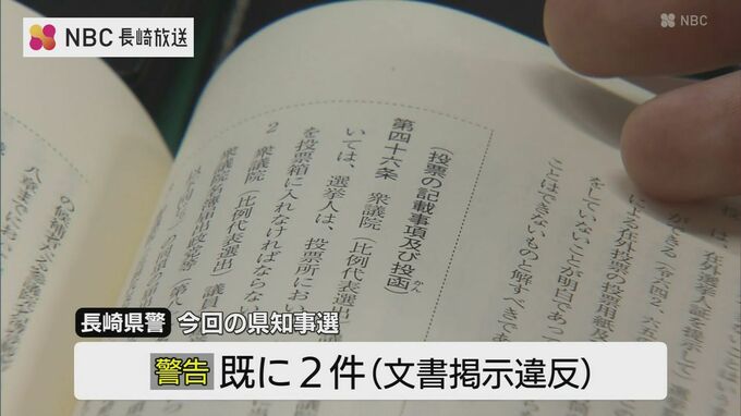 長崎県警によりますと、前回・2022年の長崎県知事選挙では、文書掲示違反など計22件の警告が出されたということです。
