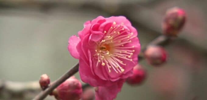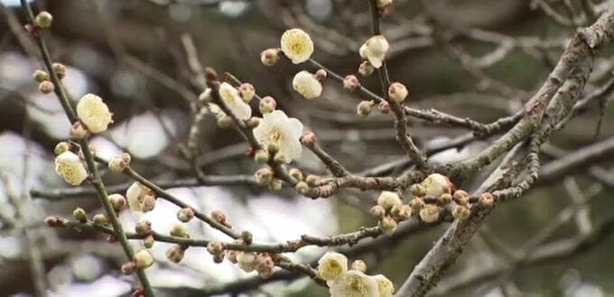 20種類およそ200本の梅が植えられている兼六園の梅林では、12月中旬、「冬至梅」の白い花が真っ先に咲き始め、今は淡い紅色の「八重寒紅」や、甘く強い香りが特徴の黄色い花「素心蝋梅」が開花しています。