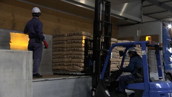 作業員が消毒用の消石灰をトラックに次々に積み込んでいきます。