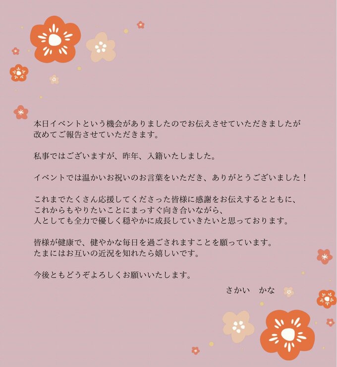 さかいさんは、【ご報告】と題して、梅の花のイラストの描かれた文書を投稿。書面には、「私事ではございますが、昨年、入籍いたしました」「これまでたくさん応援してくださった皆様に感謝をお伝えするとともに、 これからもやりたいことにまっすぐ向き合いながら、 人としても全力で優しく穏やかに成長していきたいと思っております」と、綴りました。
