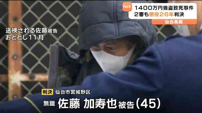 判決などによりますと仙台市宮城野区の無職、佐藤加寿也被告(45)は、2024年2月、リフォーム工事を担当していた仙台市青葉区の住宅に侵入し、住人の当時72歳の男性に体当たりするなどして死亡させ、家に置いてあった現金約1400万円を奪った強盗致死などの罪に問われています。