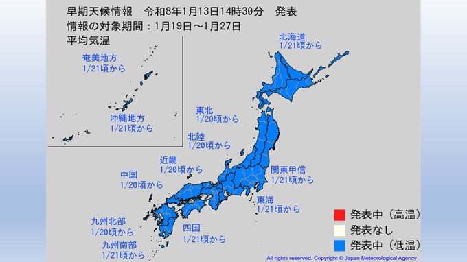 気象庁は13日、「低温と大雪に関する早期天候情報」を発表しました。