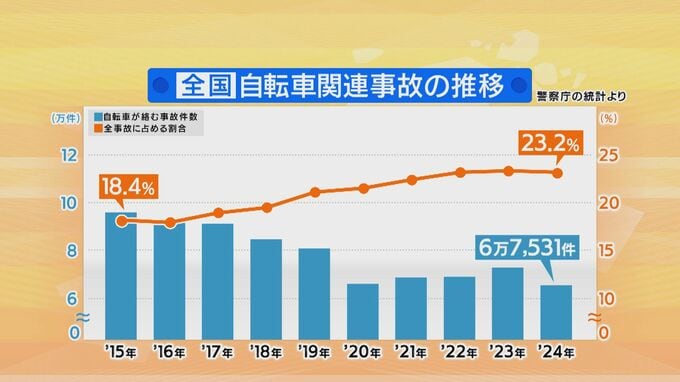自転車が絡む事故の件数自体は減少傾向にあるものの、交通事故全体に占める割合はこの10年で増加傾向となっており、安全意識の向上が急務となっています。