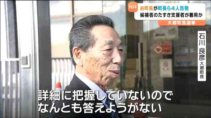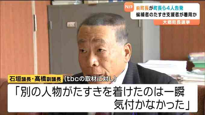 2025年宮城県の大郷町選挙で、石川良彦(いしかわ・よしひこ)町長の支援者が候補者本人のたすきを身に着け選挙運動したとされる問題についてです。田中學(まなぶ)前町長は13日、石川町長ら4人について公職選挙法違反にあたるとして刑事告発しました。