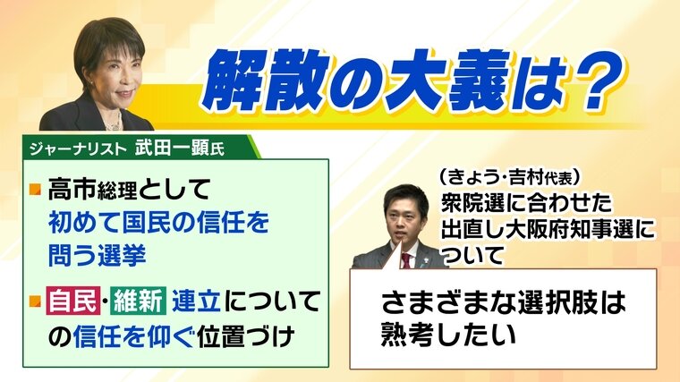 武田氏:「高市さんは自民党員に選ばれただけなので、自分が総理にふさわしいかを問うという意味では『解散の大義はある』。ただこれまで主張していた『経済の成長を実感してもらう』など、これまでの主張との整合性が問われる。また、金曜(9日)深夜に“解散報道”が出てから一度も高市総理は説明していない。何日も経っているのに説明できないというのは、なかなか納得が得られないでしょう」