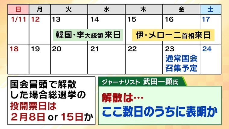 武田氏:「解散総選挙は大きな政治イベントであり、お祭りですから『はい解散します、明日投票です』というわけにもいかないわけです。公示期間もあります。そうすると、高市総理が早いうちに表明しないと大わらわになります。早ければ伊・メローニ首相が帰国したあと17日に表明か、あるいは19日に表明かという説も出ています。19日であれば(通常国会の召集予定まで)4日しかないのでいろいろな点で間に合いませんし、すでに『だまし討ち解散』と言われている以上、何かを言わないと…私は今日明日にも何らかの表明があるかもしれないと見ています」