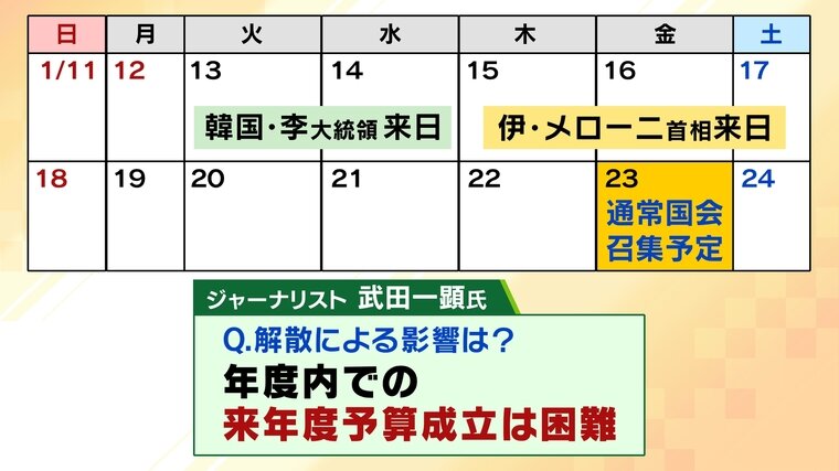 武田氏:「最短の2月8日に投開票された場合、自民党が大きく勝てば成立させられると言っている人もいますが、私は日程的に厳しいと思います。しかも参議院は依然として少数与党のまま。国民民主党と組む話がうまくいっていたようだったのに、いま玉木代表は解散に怒っているから参議院でもめるだろう。なので、冒頭解散の場合は年度内の予算成立はきわめて困難だとみています」