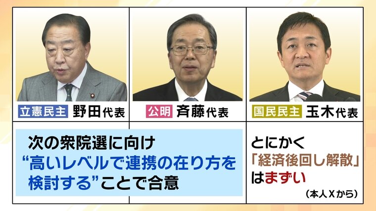 一方の野党はどう反応しているのか。立憲民主党の野田代表と公明党の斉藤代表は、次期衆院選に向けて「高いレベルで連携のあり方を検討する」ことで合意したといいます。また、国民民主党の玉木代表は「とにかく経済後回し解散はまずい」と自身のSNSで発信しています。