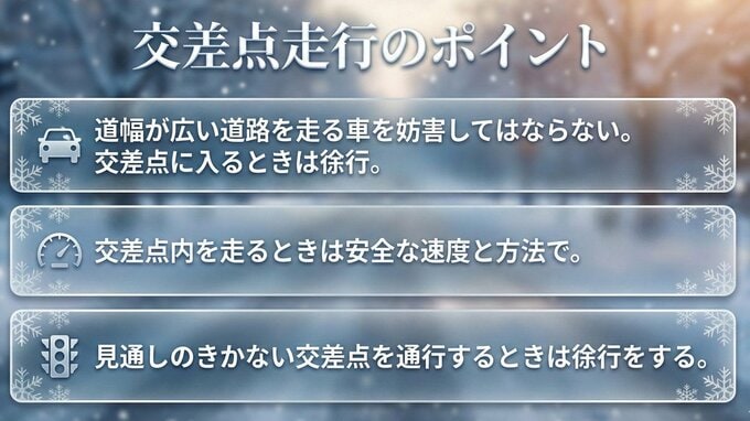 「道幅が広い道路を走る車を妨害してはならない。交差点に入るときは徐行」