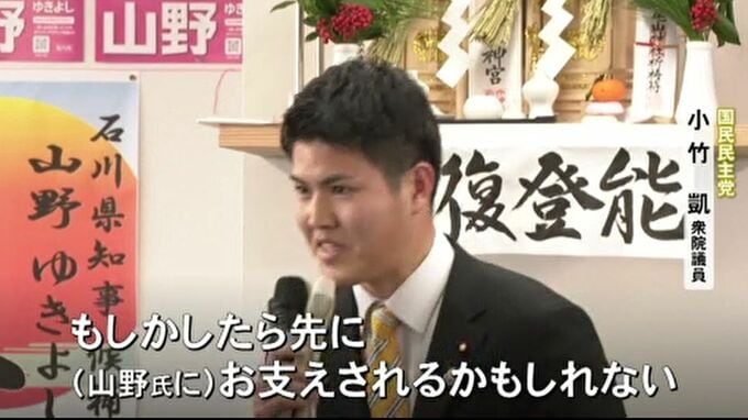 一方、対する野党・国民民主党の小竹凱氏は「何やら怪しい国政の噂が色々飛んでいて、私が山野さんをお支えすると言ったものの、もしかしたら先にお支えされるかもしれません」と語りました。