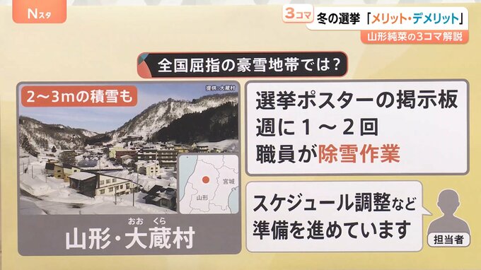 この時期は2〜3mの雪が積もることもある、山形・大蔵村では、2025年1月に選挙が行われました。その際には、選挙ポスターの掲示板を、週に1〜2回、職員が除雪作業を行ったといいます。
