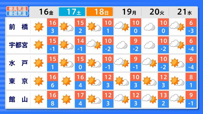 関東甲信地方の気温は、向こう1週間程度は寒気の影響を受けにくいため高いですが、その後は冬型の気圧配置が強まる時期があり、寒気の影響を受けやすいため低い日が多く、21日頃からはかなり低くなる可能性があります。また、21日頃からは長野県北部・群馬県北部を中心に降雪量がかなり多くなる可能性があります。農作物の管理や水道管の凍結等に注意するとともに、除雪などの対応に留意してください。また、今後の気象情報等に留意してください。