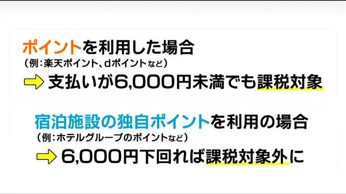 しかし、宿泊施設独自のポイントを使用した場合、これは値引きとみなされるため、実際の支払いが6000円未満になれば、課税対象外になるんです。