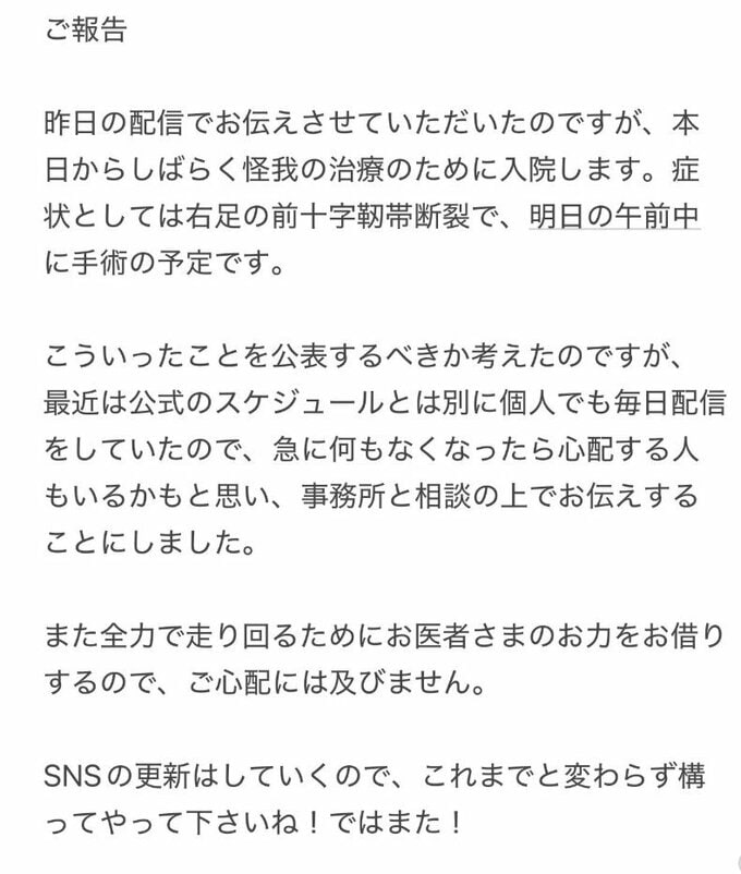 歌広場さんは「本日からしばらく怪我の治療のために入院します」「症状としては右足の前十字靭帯断裂で、明日の午前中に手術の予定です」と報告。「また全力で走り回るためにお医者さまのお力をお借りするので、ご心配には及びません」とファンに伝えています。