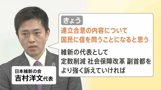 吉村洋文代表は13日、解散について「連立合意の内容について国民に信を問うことになると思う。維新の代表として定数削減、社会保障改革、副首都をより強く訴えていければ」としています。