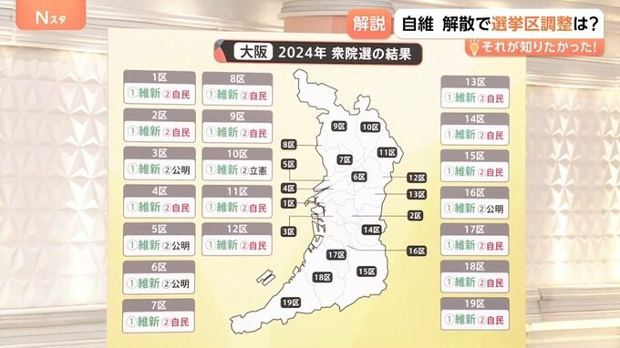 2024年の衆院選の結果からも、大阪では自民と維新が直接対決している選挙区がとても多いことが分かります。