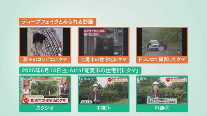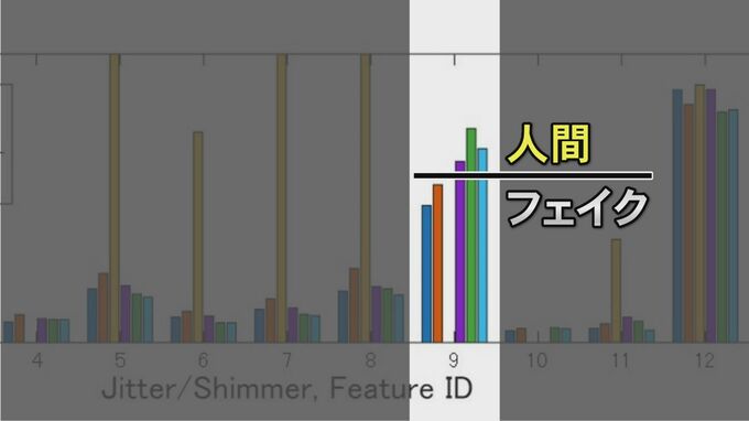 「このラインで上が本物、下が偽物というのが分かるようにこういう手がかりを今回提案している機械では判別する材料になっている、アナウンサーの声、リポーターの声は本物、クマはフェイクと答えが出た。」