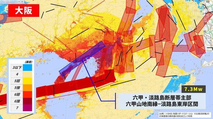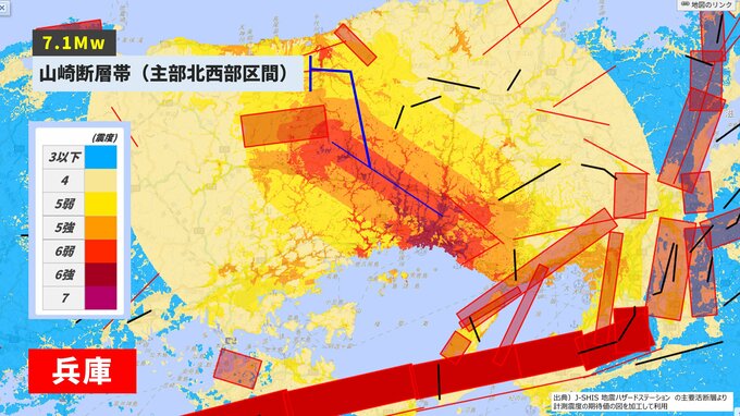 「黄色は安全」の誤解 島根も能登も“低確率”の場所だった 京大西村教授「確率の数値だけで判断してはいけない」 あいテレビ 2026年1月15日(木) 16:41 国内 ▼日本全国・都市近郊の活断層一覧【大阪~兵庫】 ▼兵庫・大阪近郊 ●六甲・淡路島断層帯主部(六甲山地南縁-淡路島東岸区間)(ランクA) 規模:M7.9程度 確率:ほぼ0%〜1% ●山崎断層帯(主部/北西部)(ランクA) 規模:M7.7程度 確率:0.1%〜1%