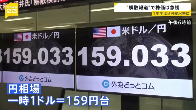 一方、外国為替市場では財政悪化の懸念から円安が急速に進み、円相場が一時1ドル=159円台をつけました。約1年半ぶりの円安水準です。