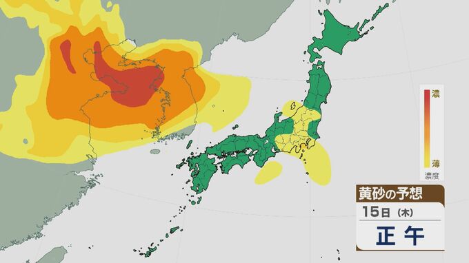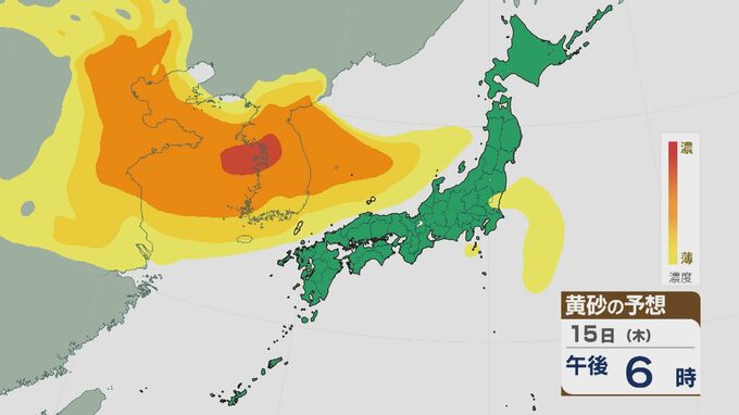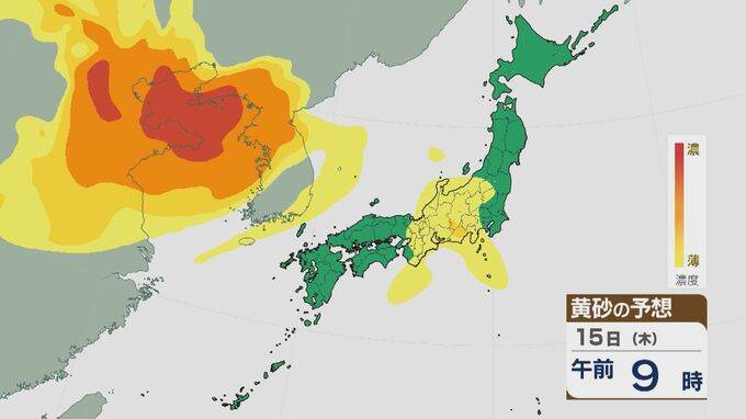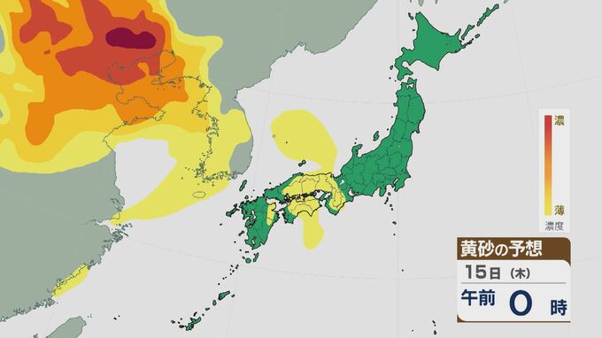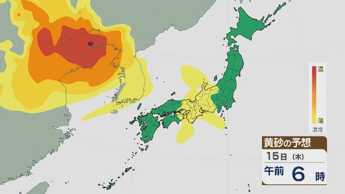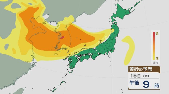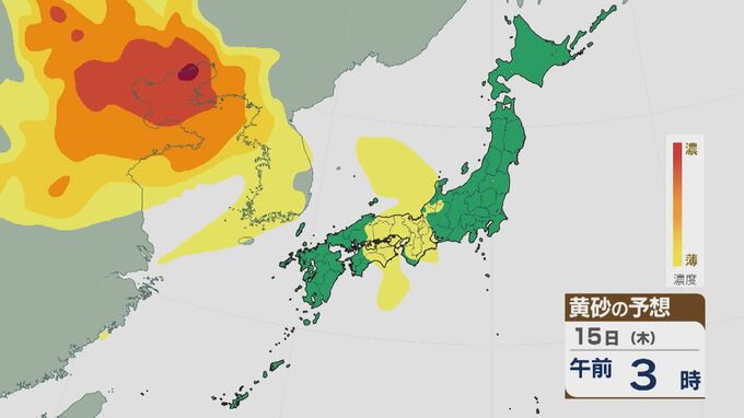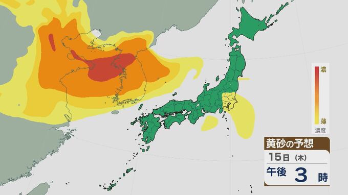 【黄砂情報】大陸からの黄砂は14日(水)以降日本列島に飛来 16日(金)は九州から東北南部の広範囲に及ぶおそれ 最新の飛来予想シミュレーション 北陸放送 2026年1月14日(水) 09:30 国内 15日の午前は近畿や東海・北陸などに飛来するでしょう。夜のはじめごろから大陸から再び東西に長く連なった黄砂の帯がやってきそうです。