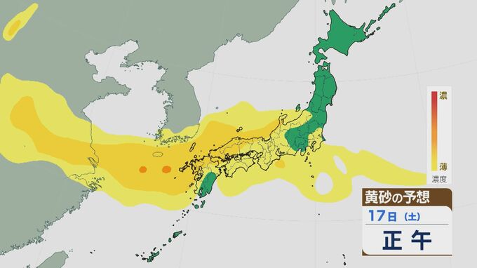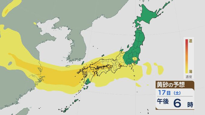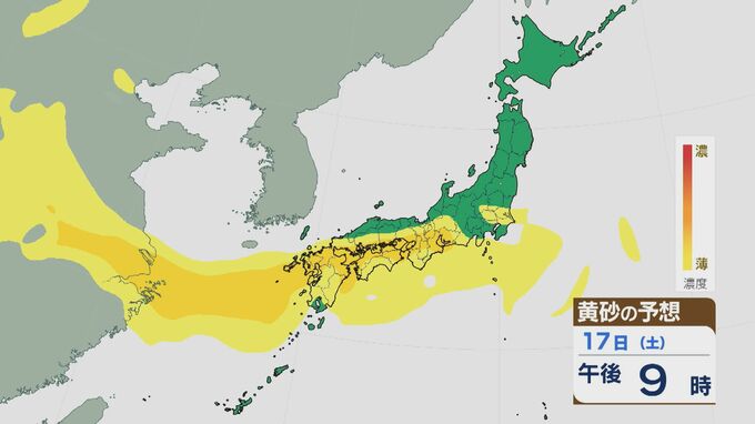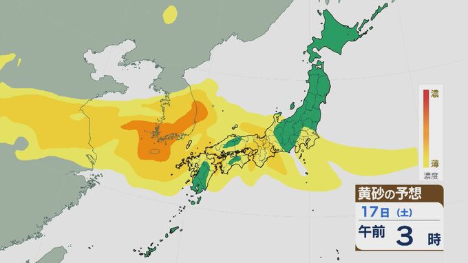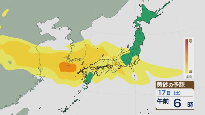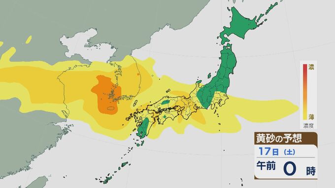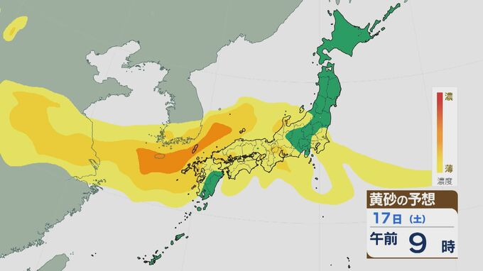 【黄砂情報】大陸からの黄砂は14日(水)以降日本列島に飛来 16日(金)は九州から東北南部の広範囲に及ぶおそれ 最新の飛来予想シミュレーション 北陸放送 2026年1月14日(水) 09:30 国内 17日(土)も、日中は九州から東海・北陸まで黄砂が確認されそうです。