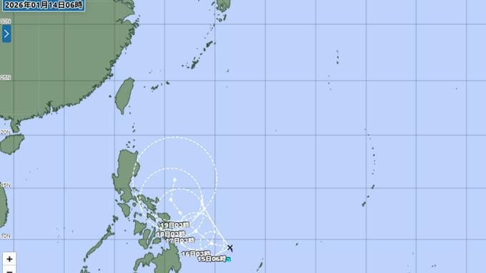 気象庁は14日午前、フィリピンのミンダナオ島の東にある熱帯低気圧が、24時間以内に「台風」に発達する見通しであると発表しました。発生すれば2026年最初の台風となり「台風1号」と呼ばれます。