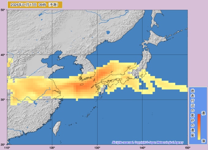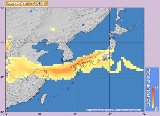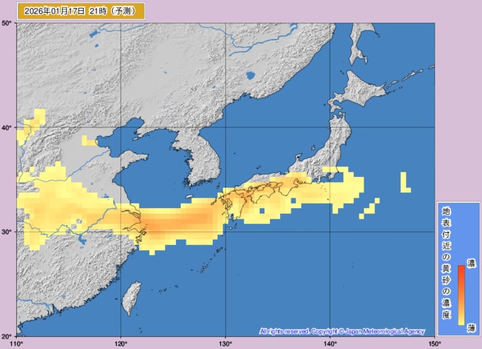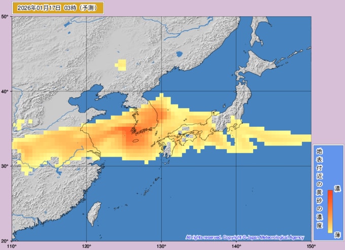 【黄砂情報】日本列島の広範囲に...14日~17日にかけて黄砂飛来か 14日~17日の黄砂シミュレーション いつどこに、どれくらい飛んでくる? 黄砂を上空から見たデータで確認 気象庁発表 テレビユー山形 2026年1月14日(水) 12:00 国内 ■17日も日本列島の広範囲に飛来か ※画像は気象庁より