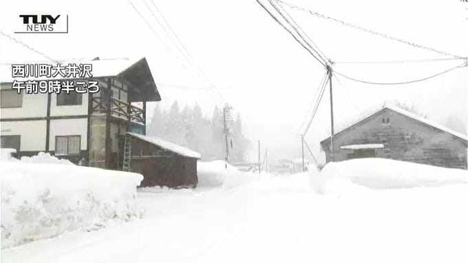 午前9時半ごろの西川町大井沢です。降り続く雪で街は真っ白に染まっています。