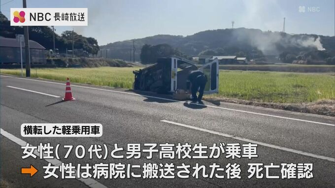 横転した軽乗用車には70代の女性と男子高校生が乗っていて、運転していた70代の女性が意識不明のまま市内の病院に搬送され、その後、死亡が確認されました。