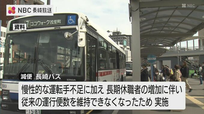 長崎自動車によりますと、路線バスなどの減便は、慢性的な運転手不足に加え、長期休職者が増えたことに伴い従来の運行便数を維持できなくなったため行うものです。