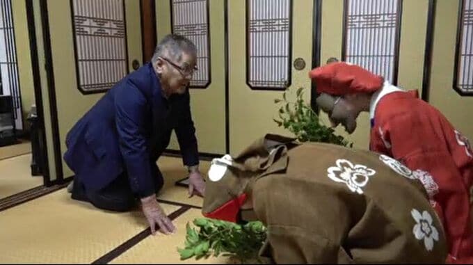 夫婦の神様「面様」に扮した子どもたちは、玄関先でサカキの小枝を叩き面様年頭と唱えます。面様が家の主に迎えられ神棚がある部屋に通されると、年賀の挨拶を受けます。