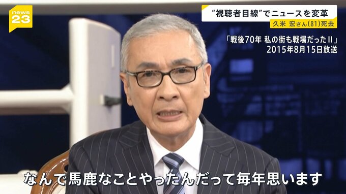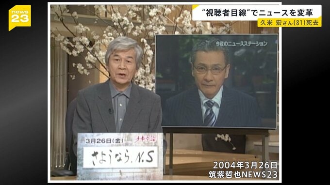 夜のニュース番組としてしのぎを削ってきた「NEWS23」の当時のキャスター‧筑紫哲也さんが番組内で久米さんの功績をたたえました。