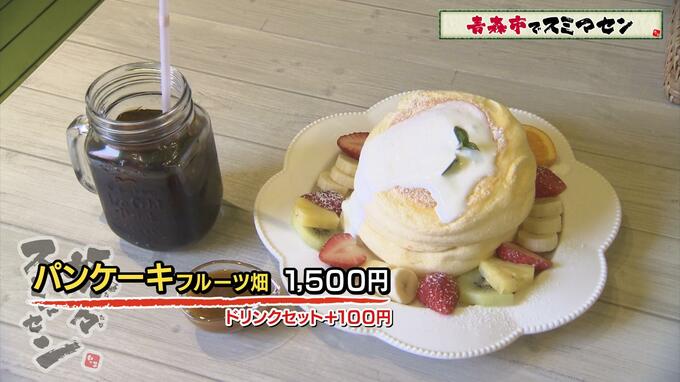 八郎さんが注文したのは、フルーツがたっぷり添えられた、その名も【パンケーキ フルーツ畑】(1500円)。柔らかそうなパンケーキに、バナナ、イチゴ、パイナップル、キウイなど色とりどりのフルーツと、ココナッツパウダーがトッピングされた贅沢な一品です。八郎さん、パンケーキを一口。