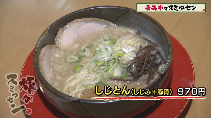 白川アナは【しじとん(しじみ+豚骨)】(970円)を注文。豚骨スープに十三湖産シジミのエキスをたっぷり混ぜているそうです。
