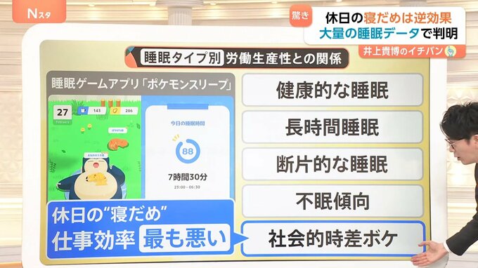 上記のように分けられる「睡眠タイプ」の中で、仕事の効率が最も悪いのは休日に“寝だめ”をする「社会的時差ボケ」タイプでした。