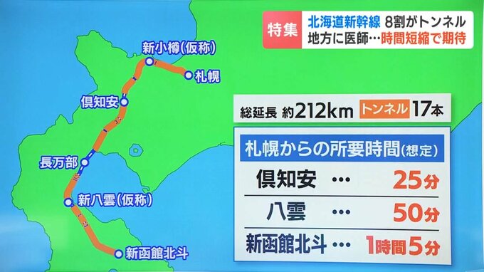 17本のトンネルがあり、総延長は212キロほどです。札幌から各駅の想定される所要時間は、倶知安まで25分。八雲まで50分。新函館北斗までは1時間5分ほどで結ばれる予定です。