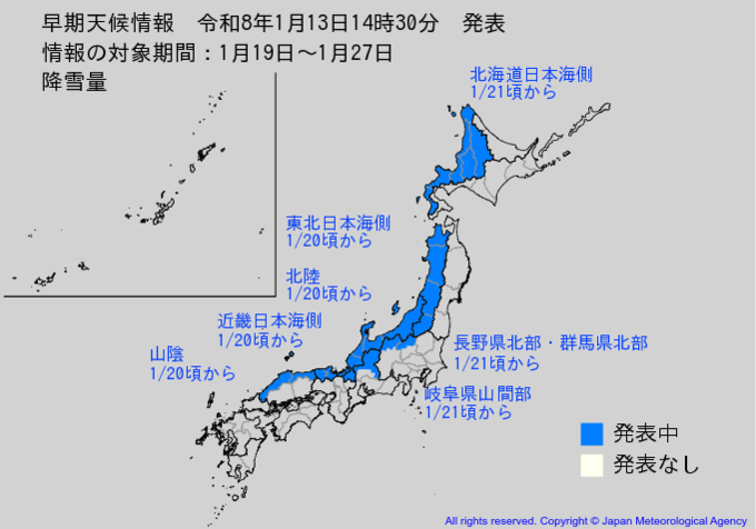 北海道地方の気温は、向こう1週間程度は平年並の日が多いですが、その後は冬型の気圧配置が強まる時期があり、寒気の影響を受けやすいため低く、21日頃からはかなり低くなる可能性があります。また、21日頃からは北海道日本海側を中心に降雪量がかなり多くなる可能性があります。農作物の管理や水道管の凍結等に注意するとともに、除雪などの対応に留意してください。また、今後の気象情報等に留意してください。