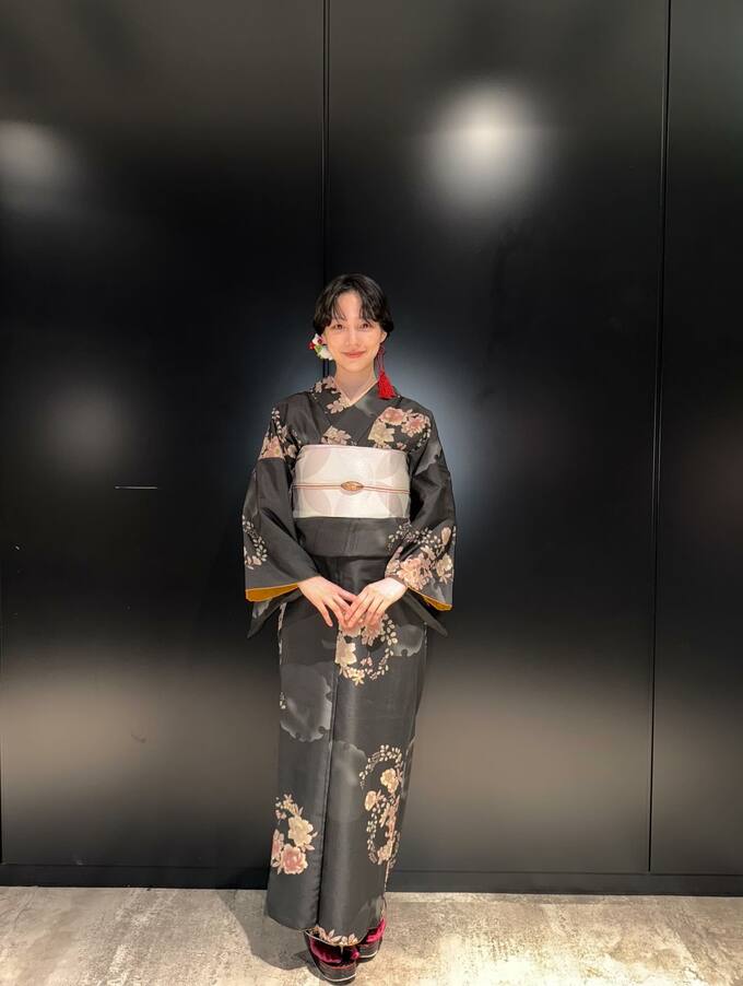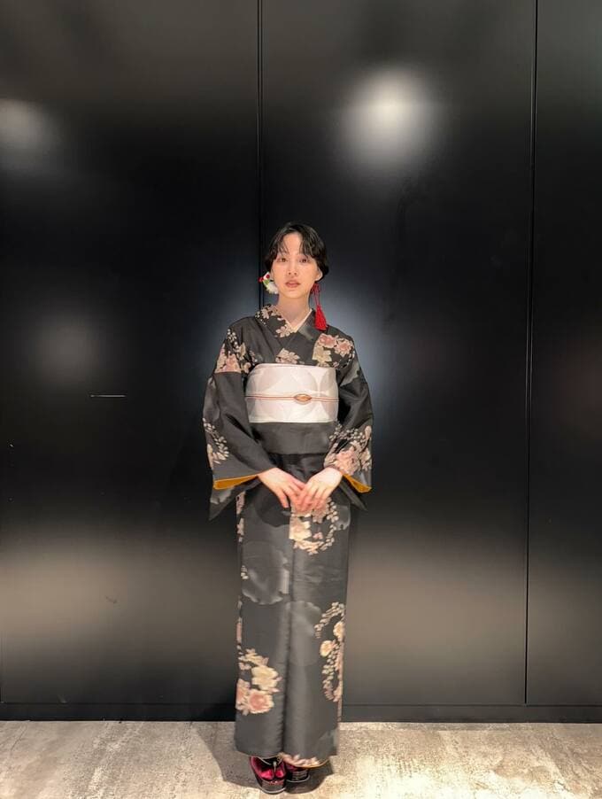 のんさんは黒地に淡いピンクや乳白色の花模様が散りばめられた着物を着用。帯は白地に薄いグレーの模様があり、赤い紐がアクセントとなっています。
