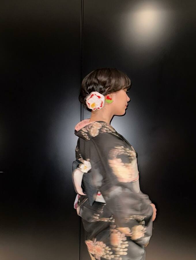 別のカットでは、横向きに立つ姿も披露。髪は黒く艶やかに整えられ、髪飾りには、着物とリンクした白と赤の花模様の装飾があしらわれています。