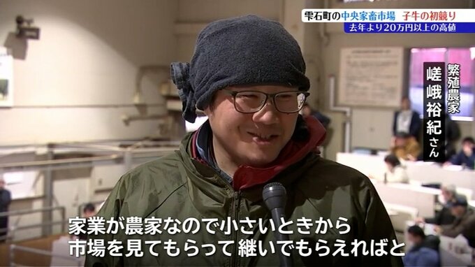 盛岡市の繁殖農家、嵯峨裕紀さんは2人の息子と父親の美紀さんの4人で競りの様子を見つめていました。